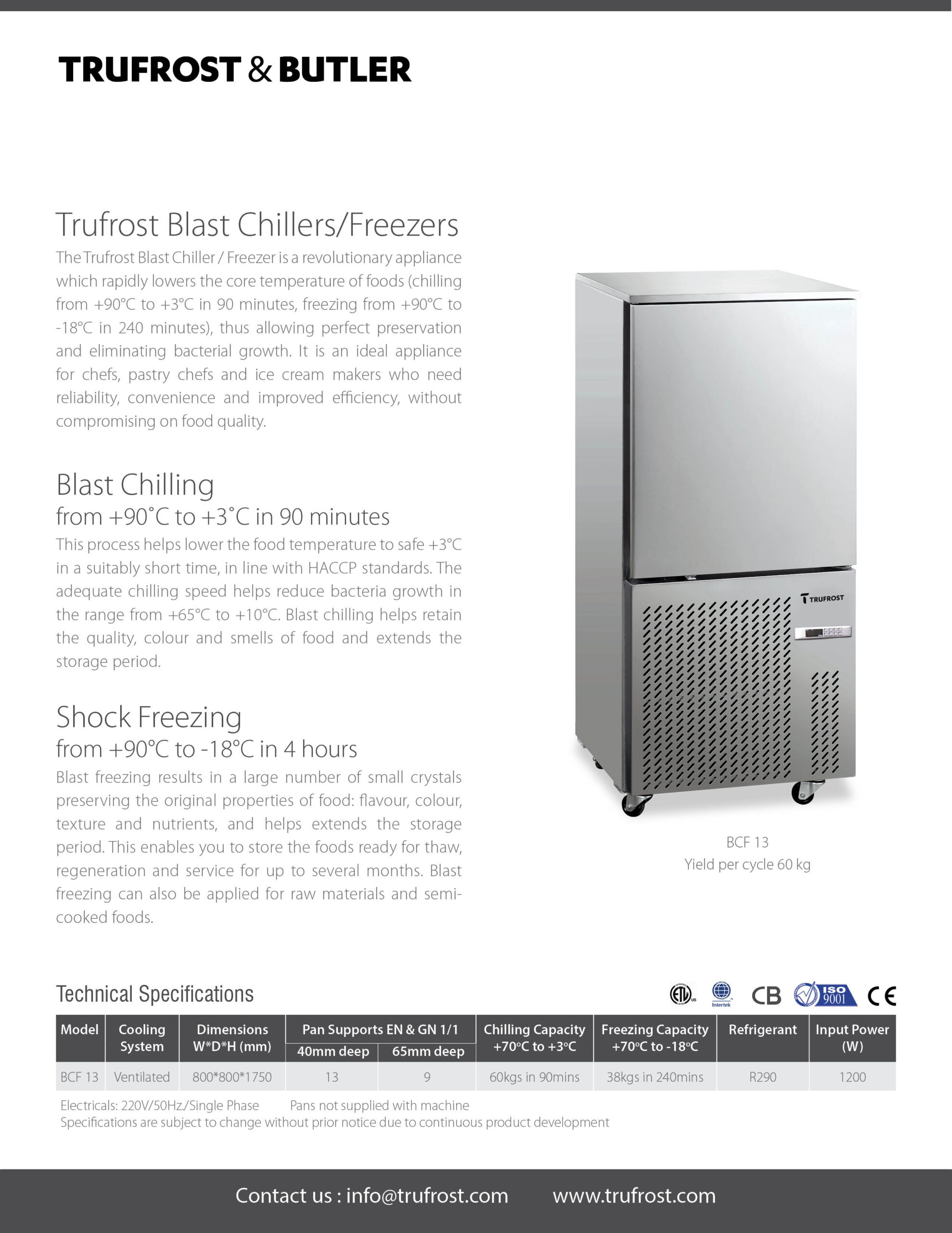 Trufrost Blast Chillers / Freezers are ideal for bringing the temperature of cooked food from 90°C to +3°C or – 18°C rapidly thereby safe-guarding it from bacterial growth and rendering it fit for subsequent storage and consumption. Designed to accommodate 13 trays, this model is suitable for both GN 1/1 and EN 400x 600 mm tray sizes.