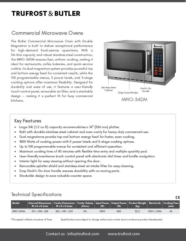 The Butler Commercial Microwave Oven with Double Magnetron is built to deliver exceptional performance for high-demand food-service operations. With a 34-litre capacity and robust stainless steel construction, the MWO-34DM ensures fast, uniform cooking, making it ideal for restaurants, cafés, bakeries, and quick-service outlets. Its dual magnetron system provides powerful top and bottom energy feed for consistent results, while the 100 programmable menus, 5 power levels, and 3-stage cooking options offer maximum flexibility. Designed for durability and ease of use, it features a user-friendly touch control panel, removable air filter, and a stackable design — making it a perfect fit for busy commercial kitchens.