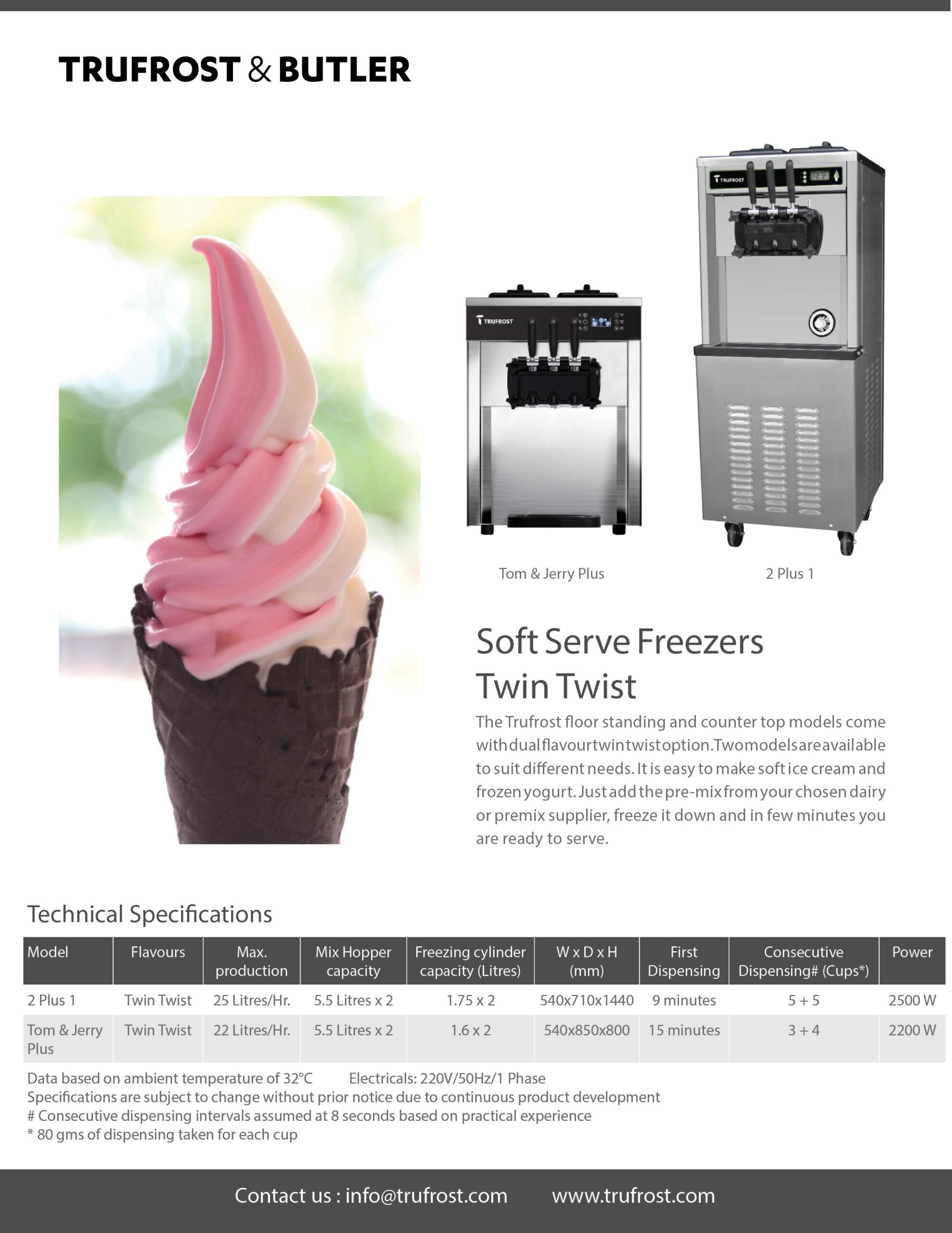 The Trufrost floor standing and counter top models come with dual flavour twin twist option. Two models are available to suit different needs. It is easy to make soft ice cream and frozen yogurt. Just add the pre-mix from your chosen dairy or premix supplier, freeze it down and in few minutes you are ready to serve.